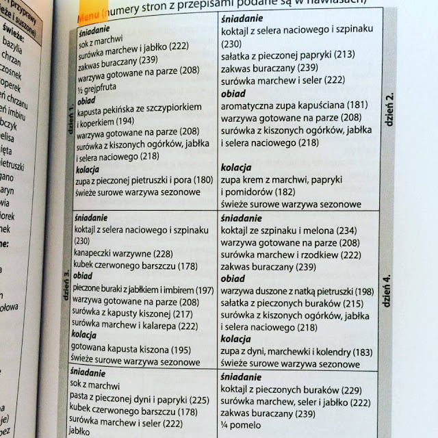 Kiedy już pozytywnie przejdziemy przygotowanie, możemy zacząć oczyszczanie organizmu. Najpierw jednak wybieramy jego rodzaj: do wyboru jest jaglano-warzywny (polecany osobom, które na co dzień nie odżywiały się prawidłowo), owocowo-warzywny (dla bardziej zaawansowanych) i głodówka wodna lub sokowa. Ja wybrałam owocowo-warzywny. Musimy pamiętać, że aby przystąpić do detoksu, powinniśmy być naprawdę zmotywowani, pozytywnie nastawieni. Nastawienie bowiem jest niesamowicie ważne, to połowa sukcesu. Nie będę tu mydliła oczu, że detoks to kaszka z mleczkiem. To poważna i trudna sprawa. Mimo dobrego przygotowania i pewności, że przejdę cały detoks, miałam dwa poważne kryzysy, kiedy chciałam się poddać. Warto też zaplanować sobie menu, zrobić wcześniej zakupy. Świetną sprawą jest to, że podane przepisy na zupy, leczo są rozpisane na dwa, trzy dni. Tak więc, nie trzeba się przejmować tym, że codziennie będziemy musieli stać przy kuchence. Nic z tych rzeczy 🙂 Fajna sprawa, o której ja niestety nie wiedziałam i zaopatrzyłam lodówkę, jakby miał nastąpić koniec świata. Część produktów musiałam później wyrzucić 🙁