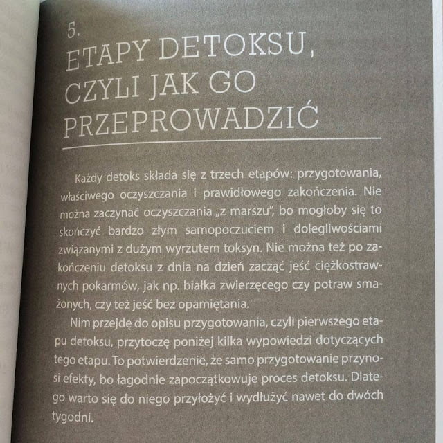 I tak doszliśmy do końca detoksu. Od nas zależy, jak będziemy po nim żyli. Ja z własnego doświadczenia mogę powiedzieć, że bardzo przyzwyczaiłam się do pór spożywania posiłków, ich ilości i do wypijania między posiłkami szklanki ciepłej wody. Sprawdziło się to u mnie i bardzo sobie taki styl jedzenia chwalę. Oczywiście jem zdrowo. Nie mogłam się doczekać jajek, koktajli, mojej ukochanej owsianki z mlekiem kokosowym. Nie jem dużych porcji. Dzięki detoksowi jestem w stanie mniej zjeść, żeby się porządnie najeść i strasznie się z tego powodu cieszę, bo z ręką na sercu – potrafiłam zjeść pół kilo spaghetti… Teraz nie ma o tym mowy! Także schudłam, czego się troszkę obawiałam: – 5 kg w 10 dni, ale pozbyłam się wreszcie nadmiaru wody z organizmu, przez którą puchłam, czułam się okropnie, więc jestem przeszczęśliwa! Autorka pisała w książce, że oznakami usuwania toksyn z organizmu jest ból głowy w drugim i trzecim dniu, o którym wspominałam, pojawianie się niedoskonałości na skórze, mdłości, wymioty, nalot na języku, uczucie „kapcia” w buzi, nieprzyjemny zapach z ust (polecane jest na niego ssanie plastra cytryny). Ja należę do tych szczęśliwców, którzy detoks znieśli naprawdę dobrze, ponieważ oprócz bólu głowy, mdłości i nalotu na języku nie miałam żadnych innych objawów. Podejrzewam, że to dlatego, że naprawdę dobrze się do niego przegotowałam, restrykcyjnie podchodziłam do poleceń.